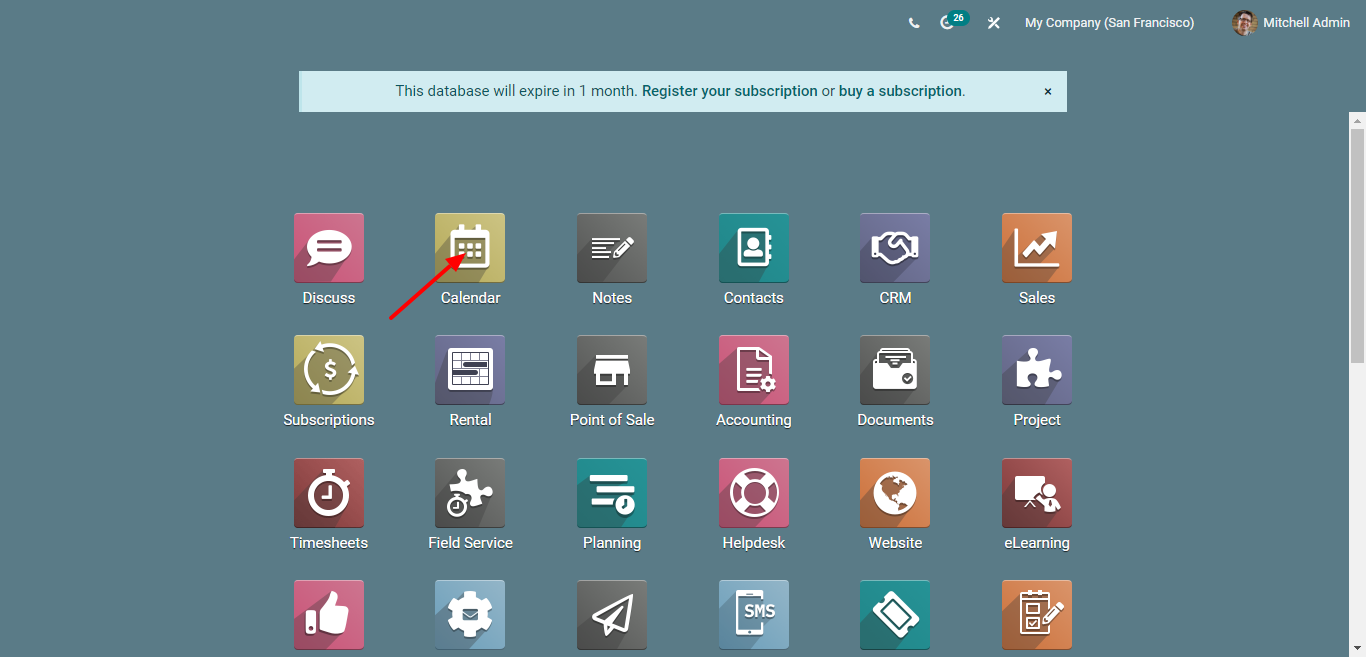 Firstly, you need to go to the dashboard of the Odoo apps. You will spot the Calendar module as shown in the screenshot given below.